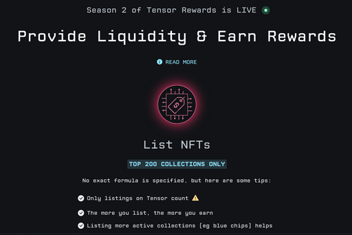 The end of their season one airdrop marked the beginning of a new season, with even more rewards than previously. To be able to receive rewards from the second season of airdrops, traders have to use TensorSwap and either bid, list, or market-make NFTs to farm points. The second season will have 5-10x more points than the previous season and is only eligible for Tensor users. Also, only traders of the top 200 collections are eligible to receive any points for future airdrops.